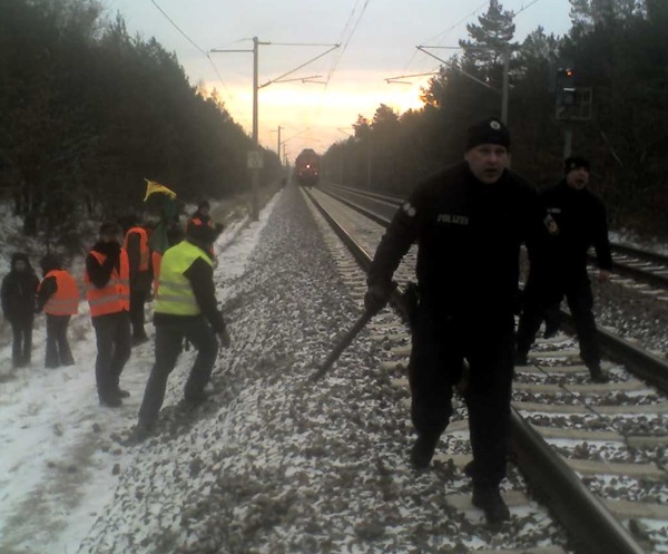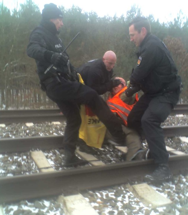 Um 9.25 Uhr wurde der Zug mit vier Castoren aus dem französischen Cadarache auf seiner Fahrt in das Zwischenlager Nord bei Lubmin gestoppt. Auf den Gleisen leisteten sich die 30 Aktivist_Innen mit der Polizei eine Verfolgungsjagd dem Castor entgegen. Vor dem Zug ließen sie sich zu einer Sitzblockade nieder. Die völlig überrumpelten Beamten drohten mit Pfefferspray und Schlagstockeinsatz. Der Begleitschutz des Transports musste seine warmen Waggons verlassen und die Protestler bewachen, bis ausreichend Nachschub am Ort war.