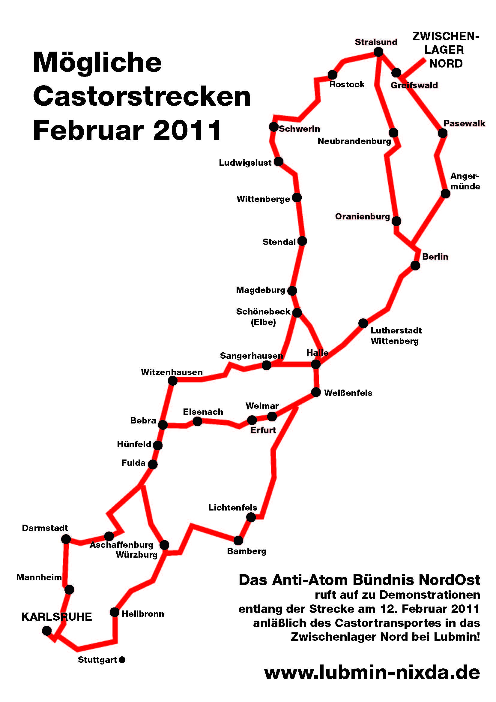 Seit Anfang Januar bereiten viele Atomkraftgegner/Bürgerinitiativen Protestaktionen entlang der möglichen Bahnstrecken des CASTOR-Transportes von der Wiederaufbereitungsanlage Karlsruhe (WAK) in das Zwischenlager Nord bei Greifswald vor. Erwartet wird der Transport zwischen dem 15. und 17. Februar 2011. Dabei sei davon auszugehen, dass die selbe Route wie bereits Mitte Dezember 210 von den Atommülltransporteuren gewählt werde, also von Karlsruhe über Mannheim und weiter über Darmstadt, Hanau, Fulda, Bebra, Eisenach, Erfurt, Weimar, Halle/Saale, Köthen, Magdeburg, Stendal, Osterburg, Wittenberge, Ludwigslust, Schwerin, Rostock, Stralsund und Greifswald. Allerdings seien beispielsweise zwischen Magdeburg und Schwerin erheblich mehr Aktionen wie Mahnwachen an Bahnhöfen, Protesten vor Rathäusern und Aktionsspaziergänge neben den Gleisanlagen in Vorbereitung als vor zwei Monaten. Am Transporttag werde in diesem Bereich mit bis zu 1.000 Atomkraftgegenern gerechnet.