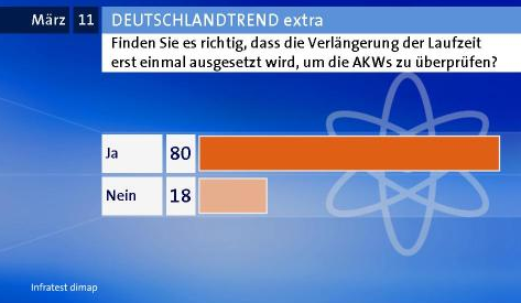 Die von der Bundesregierung angekündigte Aussetzung der Laufzeitverlängerung und Überprüfung aller deutschen Atomkraftwerke befürworten 80 Prozent der Deutschen. Ebenfalls 80 Prozent fordern, die geplante Verlängerung der Laufzeit der Atomkraftwerke von durchschnittlich zwölf Jahren ganz zurückzunehmen.