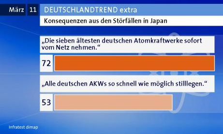 Der Vorschlag der Opposition, die sieben ältesten deutschen Atomkraftwerke sofort vom Netz zu nehmen, wird von 72 Prozent der Deutschen unterstützt. Eine Mehrheit von 53 Prozent ist der Ansicht, alle deutschen Atomkraftwerke sollten so schnell wie möglich stillgelegt werden.