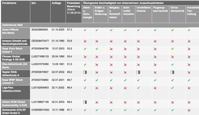 - Aktionfonts: Green Effects NAI-Werte, Espa Vinis Stock Global T, Öko-Aktienfonds (DZ Bank), Espa WWF Stock Umwelt A, Liga-Pax-Cattolico-Union, Swisscanto (CH) EF Green Invest A, Swisscanto (LU) PF Green Invest Eq. A