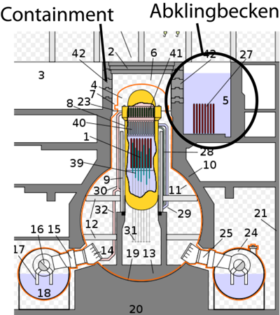 - Bei den Siedewasserreaktoren der Baureihe 69, zu denen Philippsburg I, Krümmel, Brunsbüttel und Isar-1 gehören, sind die Becken dagegen nur innerhalb des Reaktorgebäudes – außerhalb des Containments – im Obergeschoss gebaut worden.