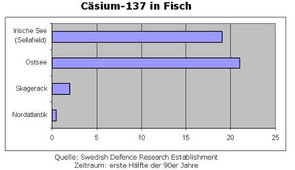 Eine Untersuchung mit dem Titel „Modellierung und Bewertung von Radioaktivitätsdosen“ aus dem Jahre 1998 des staatlichen dänischen Labors Risø hält fest, dass 94% aller durch den Menschen aufgenommen Radioaktivität über Fische geschieht.