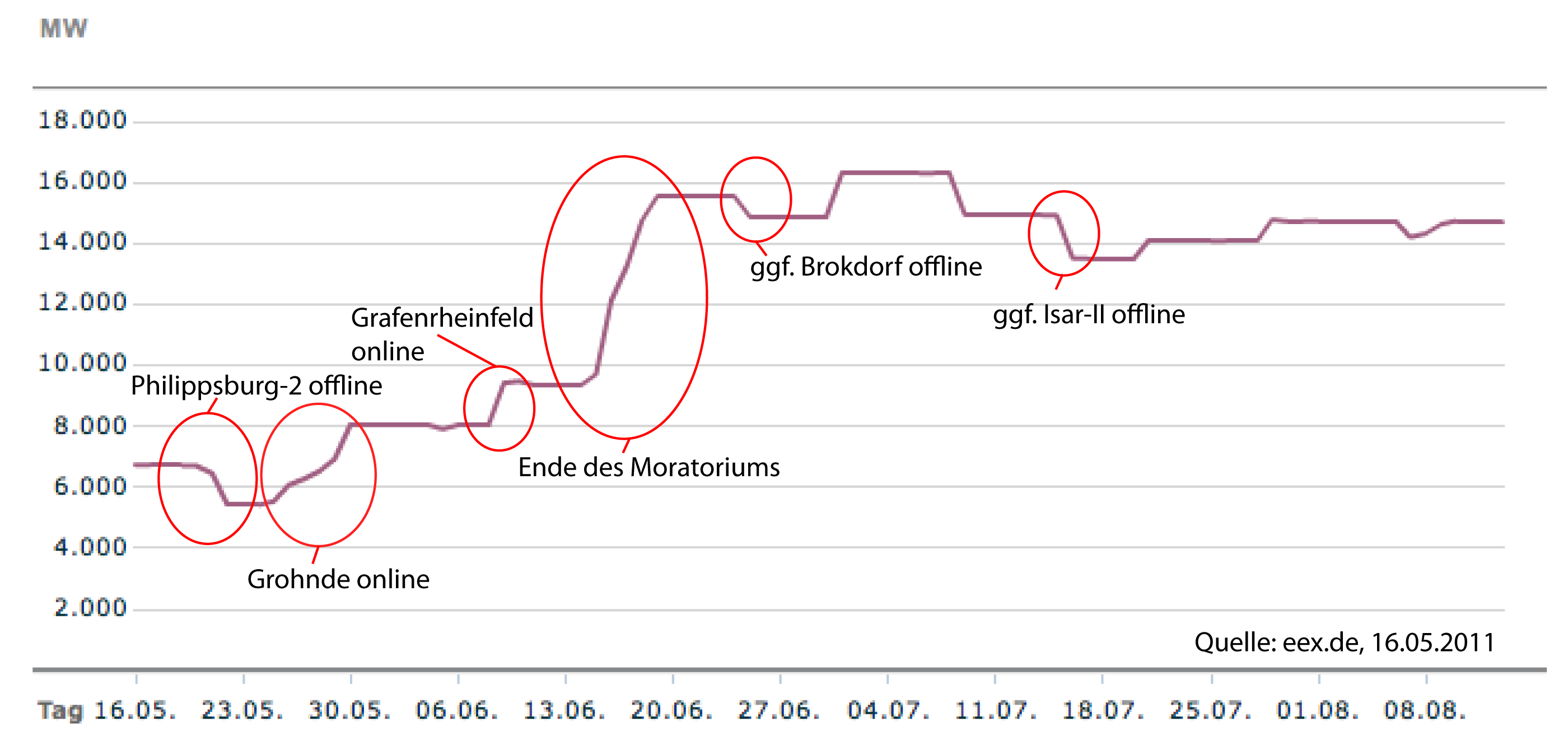 Anmerkung: Strombörse EEX und E.ON planen mit der Wiederinbetriebnahme der alten Meiler mit Ende des Moratoriums!