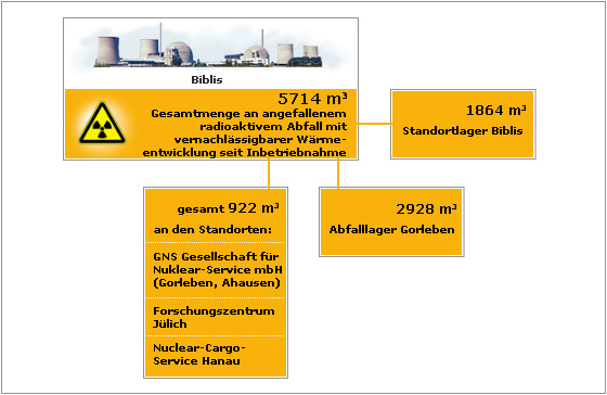 In Biblis sind bislang 5714 Kubikmeter (Endlagervolumen) konditionierte Abfälle mit vernachlässigbarer Wärmeentwicklung angefallen. Dieser Müll verteilt sich größtenteils auf das Standortlager in Biblis (1864 Kubikmeter) sowie das Abfallager in Gorleben (2928 Kubikmeter).