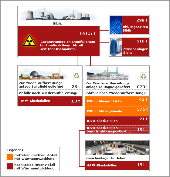 Die Grafik zeigt die seit Inbetriebnahme von Biblis angefallenen Mengen hochradioaktiven Mülls und die derzeitigen Lagerorte.