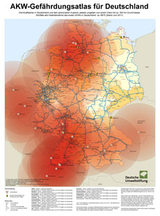 Es gibt in Deutschland Hunderte kerntechnischer Einrichtungen und Orte, an denen nukleares Material gelagert wird. Die Wichtigsten davon hat die Deutsche Umweltstiftung in die jetzt neu vorgelegte 3. Auflage des AKW-Gefährdungsatlas aufgenommen. Berücksichtigt wurde dabei die Wohnbevölkerung in einem Umkreis von jeweils 150km um die Anlagen. Dabei ergaben sich gefährdete Bevölkerungszahlen zwischen 9,4 Millionen (Isar) und bis zu 16,2 Millionen (Emsland). Besonders gefährdet sind die Menschen um Bremen, die im unmittelbaren Einzugsbereich von bis zu 6 AKWs leben müssen.