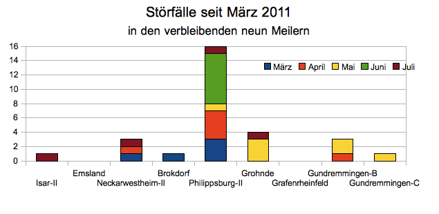 Auch gibt es in den verbleibenden neun AKW immer wieder Störfälle, zuletzt fiel der Reaktor Philippsburg-2 durch eine Serie an meldepflichtigen Ereignissen auf.