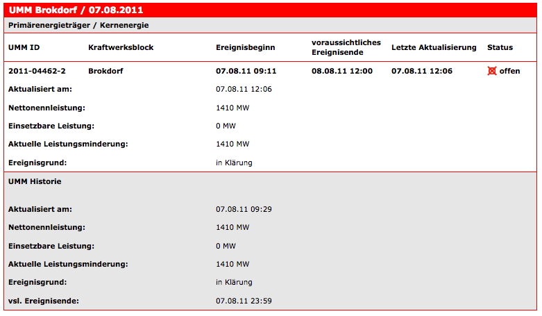 Am 20.07.2011 war der Reaktor mit mehrwöchiger Verspätung nach der 23. Jahresrevision mit Brennelementewechsel wieder ans Netz gegangen. Dabei hatte es laut Justizministerium keine Auffälligkeiten gegeben. Nun steht der Meiler an der Elbe nach einem Defekt wieder still.