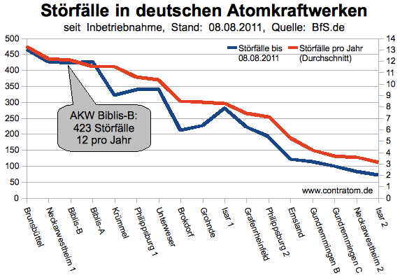 Laut Frankfurter Rundschau ist das südhessische AKW nach einer Auflistung des Bundesumweltministeriums beim Anfahren nach Stillständen das störfallanfälligste AKW Deutschlands. Fast jedes vierte der 86 Ereignisse seit 1991 bei Biblis B aufgetreten (21). Biblis-B gehört mit 423 Störfällen seit der Inbetriebnahme 1976 zu den pannenanfälligste Reaktoren Deutschlands. Die beiden Blöcke sind seit Monaten abgeschaltet – aber Pannen gibt es immer noch. Alleine im Juli meldete der Kraftwerksbetreiber RWE fünf „Zwischenfälle“ im Block B, die aber allesamt ungefährlich gewesen seien.