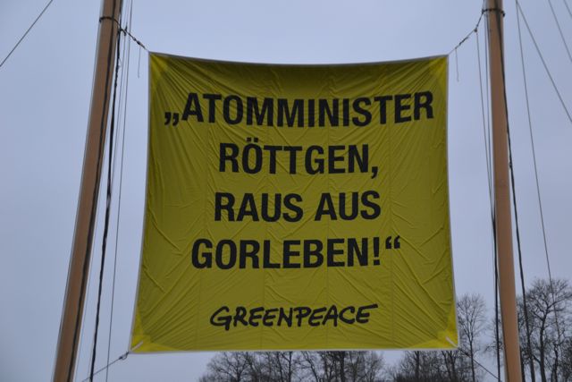 14. Dezember 2010 – Zur Stunde protestieren hunderte im Wendland während des Besuches von Bundesumweltminister Röttgen gegen den geplanten Bau des Atommüllendlagers in Gorleben. Etliche Bauern sind mit ihren Treckern gekommen und bilden auf der Zufahrt einen Spalier. Im Hafen von Hitzacker liegt das Greenpeace-Schiff Beluga-II vor Anker mit einer deutlichen Aussage zwischen den Masten: „Atomminister Röttgen: raus aus Gorleben!“