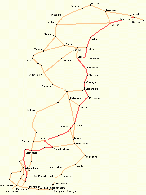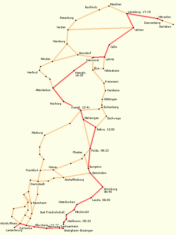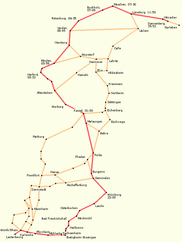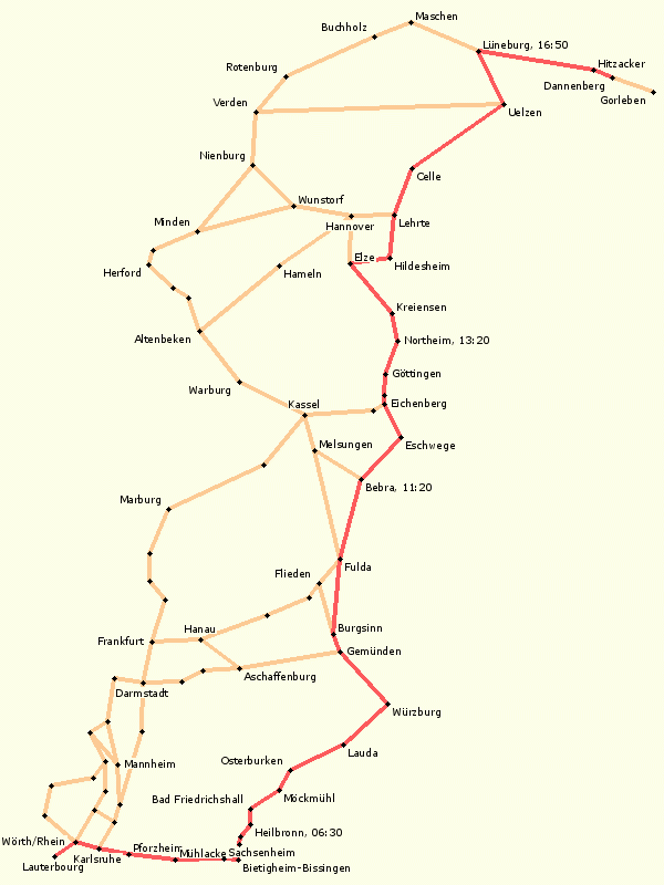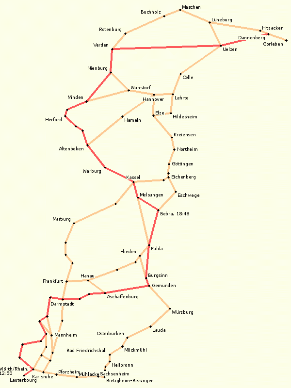 - Aschaffenburg, Lohr, Burgsinn, Neuhof, Fulda, Bad Hersfeld