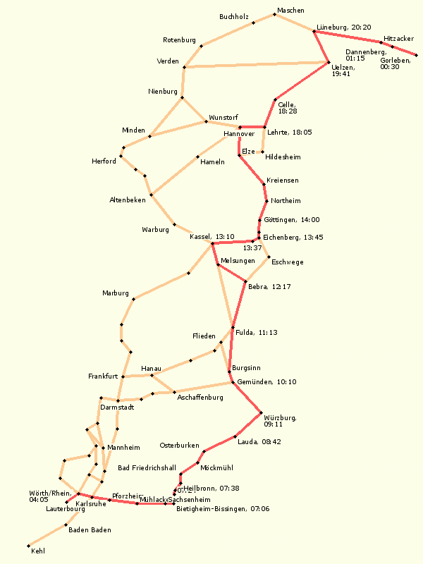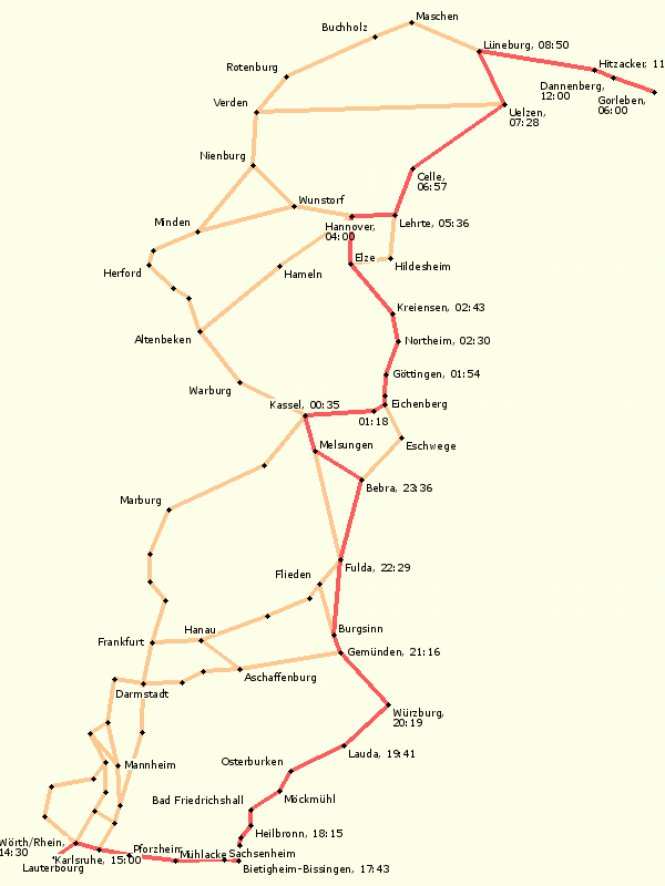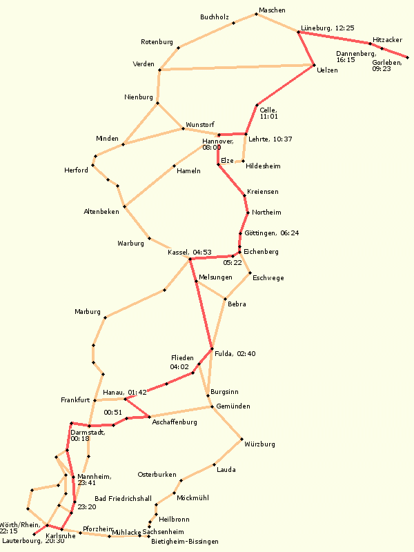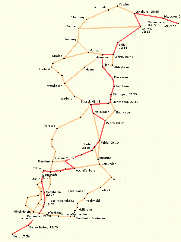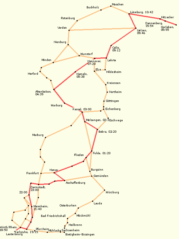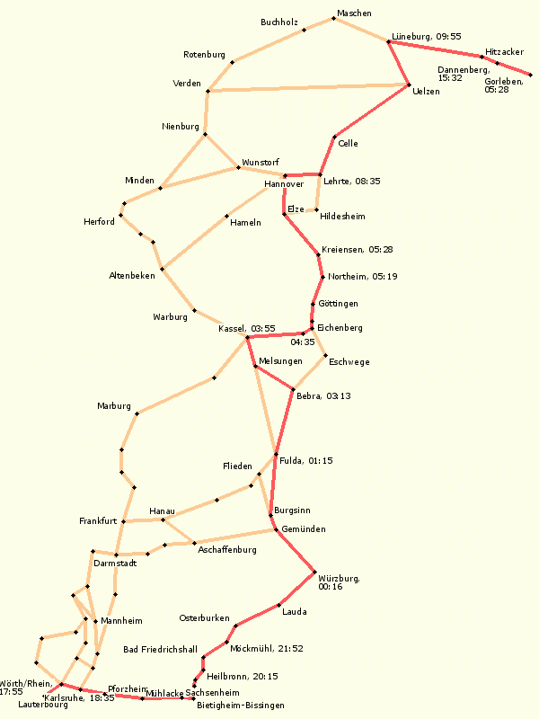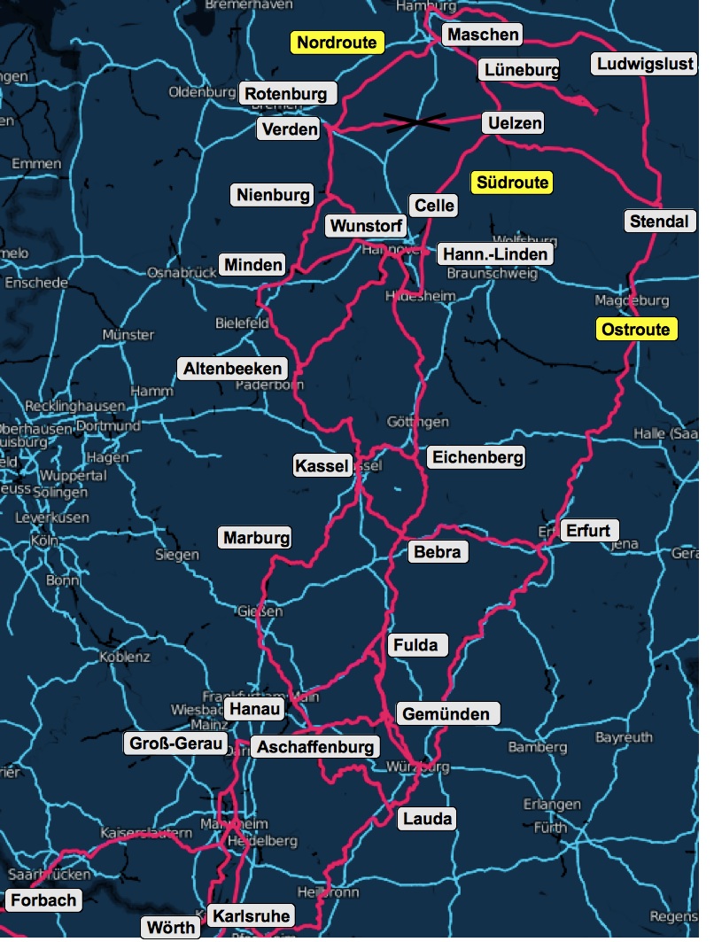 Übersichtskarte aller bislang genutzten Strecken von der Grenze bis nach Gorleben