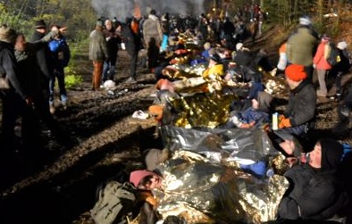 - 04:05 – Die Anzahl der Robin Wood Seilstrecken über der Straße zum Zwischenlager hat sich auf 2 erhöht: 4 Kletterer hängen über der Straße. Mehr als 45 Stunden harrten bis zu 4.000 Menschen auf der Straße zwischen Gorleben und Gedelitz vor dem Zwischenlager aus, um die Fahrt des Castor-Transports zu blockieren. Die Polizei hatte einige Mühen die friedliche Blockade schlussendlich zu räumen.