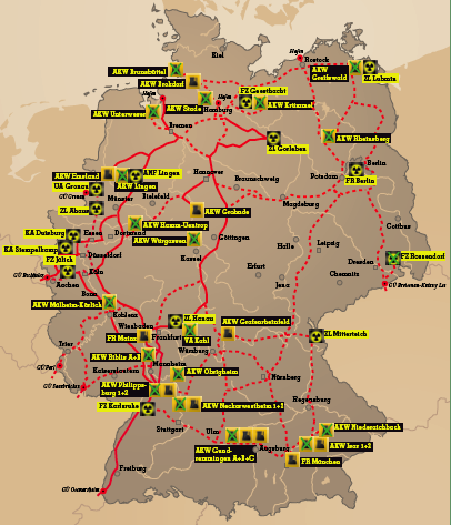 - Insgesamt gibt es 12 Standorte mit in Betrieb oder Stilllegung befindlichen Atomkraftwerken und 21 Standorte anderer Anlagen, die in nennenswertem Umfang Ausgangs- oder Zielort von Transporten radioaktiver Stoffe im Rahmen der Atomenergienutzung zur Stromproduktion sind. Darüber hinaus durchqueren Deutschland Transporte radioaktiver Stoffe zur Atomenergienutzung im Transit aus und zu europäischen Staaten und Staaten in Übersee.