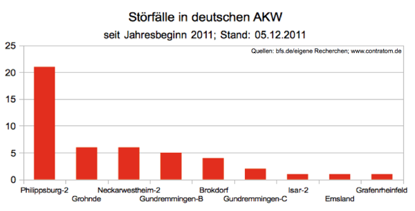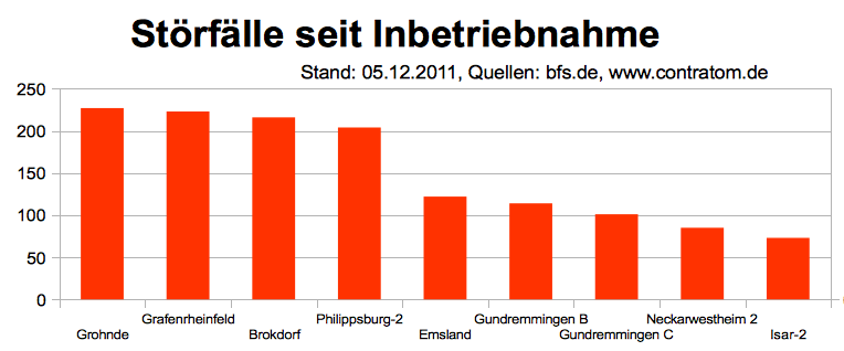 Mit nunmehr 227 Störfällen seit der Inbetriebnahme im Jahre 1984 führt das Atomkraftwerk Grohnde bei Hameln das Ranking der letzten neun Reaktoren in Deutschland an. Etwa 8,5 Mal im Jahr muss Grohnde einen technischen Defekt melden, der in seiner Art vom normalen Betriebsablauf abweichen liess.