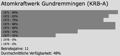 Gundremmingen-A war mit seiner Inbetriebnahme 1966 der erste kommerzielle Atomreaktor der BRD zur industriellen Stromerzeugung und gleichzeitig das damals weltweit größte AKW. Der Reaktor wurde damals komplett in amerikanischer Lizenz gebaut und wurde auch ´Demonstrationskraftwerk Gundremmingen´ genannt, da hier entscheidende Erkenntnisse für den Bau von großen AKW gewonnen wurden. Von 1966 bis 1977 wurden etwa 16 Mrd. kWh Strom produziert.
