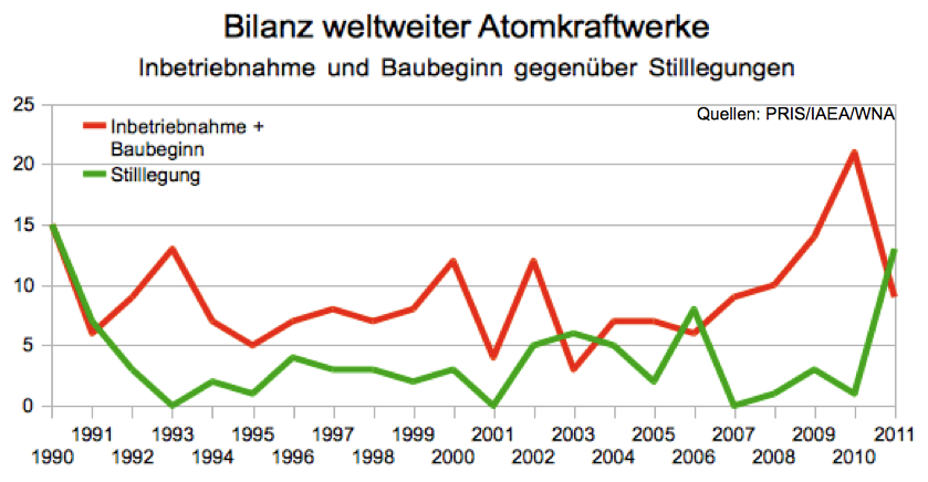 Zurzeit sind 63 Atomreaktoren zur Stromerzeugung weltweit in Bau. Bei neun von ihnen war der Baubeginn jedoch schon vor 1990. Es sind eher Bauruinen. Die älteste AKW-Baustelle ‚Watts Bar 2’ ist 39 Jahre alt und liegt in den USA. In ihr spiegelt sich das jahrzehntelange Versagen der US-Energiepolitik. Auch in China und Indien, wo in den letzten zehn Jahren mit Abstand die meisten AKW-Bauten angefangen wurden, brach diese Entwicklung erst Mal ab. Im Jahr 2011 wurde nur noch mit dem Bau eines 315 Megawatt-Reaktors in Pakistan und eines 700 MW-Reaktors in Indien begonnen. In China, wo im Jahr 2010 noch zehn AKW-Baustellen gestartet wurden, begann im Jahr 2011 kein einziger AKW-Bau. Hingegen wachsen dort die Solar- und Windkraftwerke mit immer neuen Installationsrekorden.