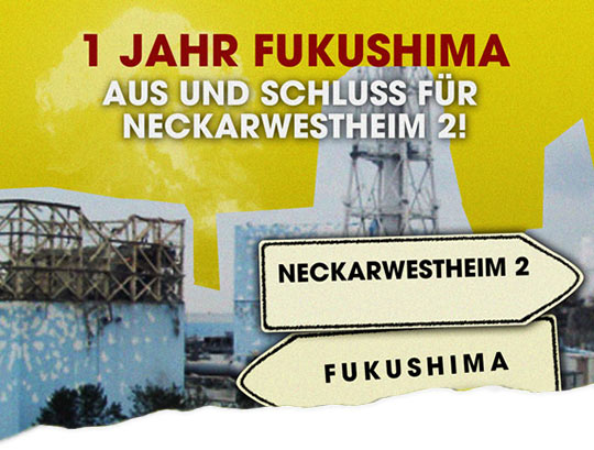 Am 11.3.2011 löste ein Erdbeben und der nachfolgende Tsunami in Japan eine nicht fassbare atomare Katastrophe aus: In Fukushima schmolzen in drei Reaktoren die Brennelemente – der nächste Super-GAU nach Tschernobyl war eingetreten. In Deutschland werden 8 Atomkraftwerke abgeschaltet, 9 erhalten eine Laufzeitgarantie. Dieser „Atomkonsens“ ist für uns nur eine Etappe. Denn erst 2015, 2017 und 2019 soll jeweils nur ein AKW stillgelegt werden. Erst in 10 Jahren, Ende 2021 und 2022, sollen die letzten sechs Atomkraftwerke stillgelegt werden – Neckarwestheim 2 als einer der letzten Reaktoren.