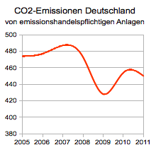 Industrie und Energieversorger haben im vergangenen Jahr weniger Kohlendioxid (C02) in die Atmosphäre geblasen als 2010. Der Ausstoß des Treibhausgases wurde auch nicht wie sonst üblich vom starken deutschen Wirtschaftswachstum getrieben, wie das Umweltbundesamt am Montag bestätigte. Stattdessen ging er in den vom EU-Emissionshandel erfassten Bereichen um rund ein Prozent auf 450 Millionen Tonnen zurück.