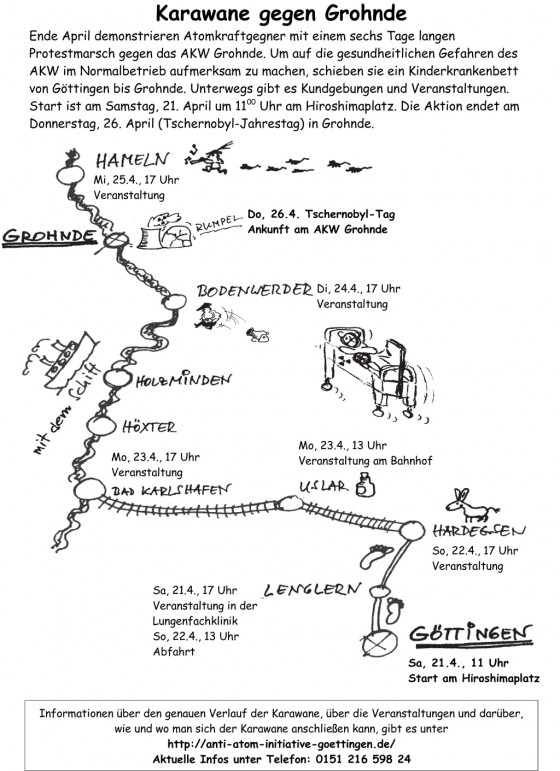 Ausgangspunkt dieser Karawane gegen Grohnde – stellvertretend für alle Atomkraftanlagen – ist der Hiroshimaplatz in Göttingen. Dort versammeln sich Sa., 21. April um 11.00 Uhr unter der Japanischen Kirsche am Fukushima-Gedenkstein Menschen und gehen die erste Etappe bis nach Lenglern. Dort findet die erste Informationsveranstaltung um 17.00 Uhr in der Parkanlage der Lungenfachklinik statt. Während des gesamten Zuges wird eigens für die Karawane vom AK gegen Atomenergie Göttingen und der Anti-Atom-Initiative Göttingen erstelltes Info-Material verteilt, sowie Material der internationalen Ärzte für die Verhütung des Atomkrieges (IPPNW). Verschiedene andere Aktionen auf dem Weg, wie Straßentheater, sind geplant. Weitere Stationen sind Hardegsen, Uslar, Bad Karlshafen, Höxter, Holzminden, Bodenwerder, Hameln. Dorthin gelangt die Karawane am 25. April. Am denkwürdigen 26. April, dem Tschernobyltag, zieht die Kinder-Krankenbett-Karawane gemeinsam mit Mitstreitern aus dem Raum Detmold und Hameln zum Atomkraftwerk nach Grohnde: