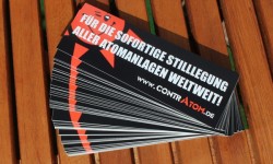 Die Aufkleber „für eine sofortige Stilllegung aller Atomanlagen“ wurde mit einer Auflage von 10.000 Stück nachgedruckt, wir schicken gern und kostenlos Exemplare an Menschen, die welche verteilen würden. Meldet euch bei supporter[ätt]contratom.de.
