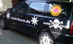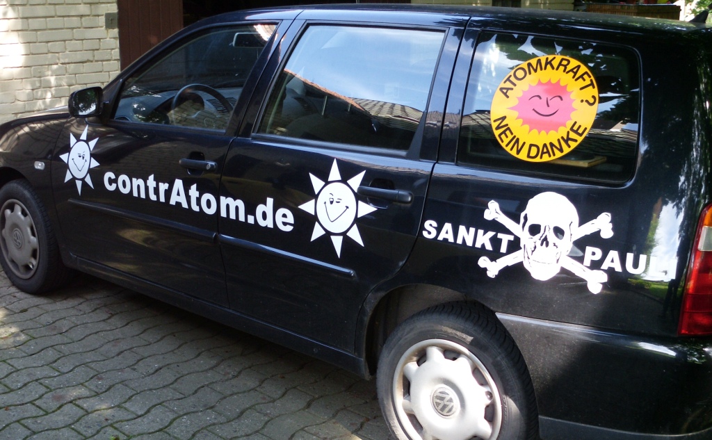 Andreas zum Beispiel fährt auf seinem Auto täglich großformatiger Werbung für uns spazieren. Mehrere Mailorder-Versandshops, wo es szenetypische Kleidung, Bücher, Aufkleber etc. zu bestellen gibt, legen ihren Paketen kostenlos unsere Aufkleber bei. Wir freuen und bedanken uns ganz herzlich auch bei allen ungenannten Unterstützern, die gemeinsam mit uns für eine atomstrom-freie Welt kämpfen.