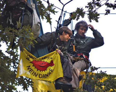 Seit 14:20 Uhr befanden sich erneut Aktivist_Innen an der Strecke östlich von Bahnhof Metelen Land im Wald (Bahnkilometer 36,2). Diesmal sind sie in die Bäume geklettert und haben eine Seilbrücke und Transparente über die Schienen gespannt.