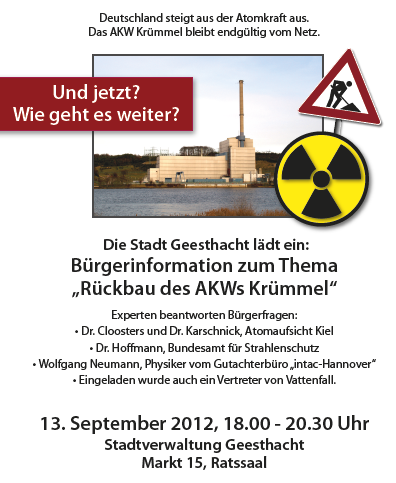 „Rückbau des AKWs Krümmel“, 13. September 2012, 18.00 – 20.30 Uhr, Stadtverwaltung Geesthacht Markt 15, Ratssaal