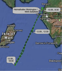 Update 18.00 Uhr: Das Schiff hat erneut den Kurs verändert und fährt nun mit Ziel Workington in Richtung Norden.