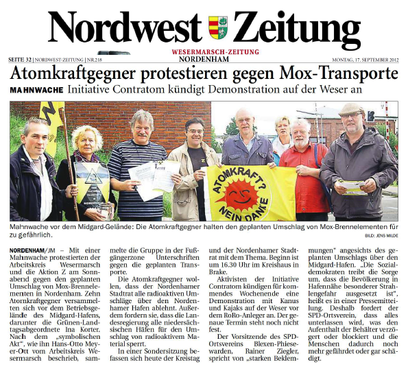 10. September 2012 – Die britische Umweltorganisation CORE warnt vor Sicherheitsmängeln bei dem für den Transport von Plutonium-Brennelementen zum AKW Grohnde geplanten Einsatz des Frachters Atlantic Osprey. Im Gegensatz zu anderen britischen Atomfrachtern, die bei Transporten von und nach Sellafield eingesetzt werden, fehlen der Atlantic Osprey mehrere sicherheitsrelevante Vorkehrungen.