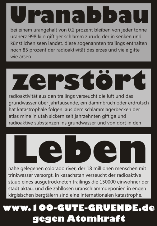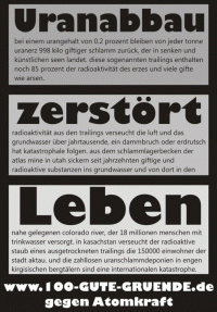 „Uranindustrie stoppen – Uranabbau, Urananreicherung, Brennelementefertigung und Atomkraftwerke stilllegen!“ Weltweit wird auch nach dem verheerenden Unglück von Fukushima Atomkraft genutzt. Dabei drohen nicht nur Katastrophen riesigen Ausmaßes durch Unfälle in Atomkraftwerken, sondern bereits der Abbau von dem Rohmaterial Uran führt zur Verseuchung ganzer Landstriche.