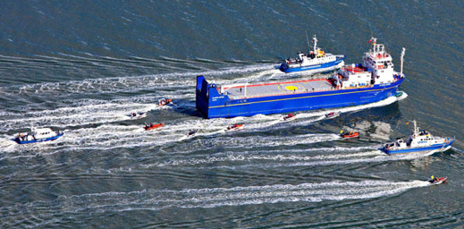 Gegen 14.00 Uhr wurden Kajaks zu Wasser gelassen und mit kräftiger Unterstützung von etwa 200 Demonstranten an Land „protest-gepaddelt“. Mit Ankunft des Schiffes gegen 16.30 Uhr blockierten 50 Atomkraftgegner mit einer Sitzblockade die Ausfahrt des Anlegers. Greenpeace empfing das Schiff mit mehreren Schlauchbooten in der Wesermündung und am Anleger: „Atomgeschäfte von EON stoppen!“. Ein Entern des Schiffes wurde durch die Polizei gestoppt, dennoch konnten sich Aktivisten auf den Bug des Schiffes setzen.