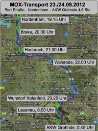 22. September 2012 – Atomkraftgegner haben nun auch direkt am Anleger des MOX-Schiffes in Nordenham eine Mahnwache angemeldet. Die Aktivisten wollen bis nach Abfahrt der LKW verharren. Auch am AKW Grohnde, dem Bestimmungsort für die brisante Fracht, sammeln sich die Gegner.