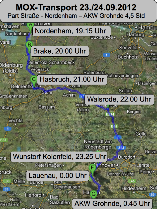 Denn in wenigen Wochen ist ein weiterer Transport mit MOX in das AKW Grohnde geplant. Gleicher Absender, gleicher Transportablauf gleiches Ziel, gleiches Risiko.