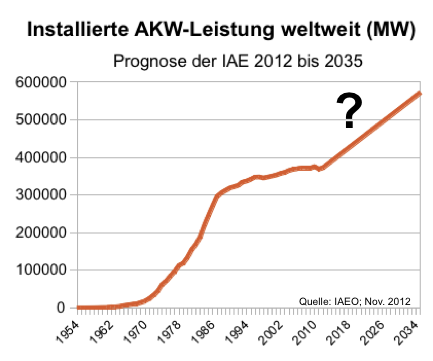 Ein noch unrealistischeres Bild zeichnete die Internationale Atomenergiebehörde (IAEO) im August 2012: sie nahm ein Wachstum um 100 Prozent bis 2030 an. Laut einer Studie der Lobbyorganisation der weltweiten Atomindustrie überlegen momentan 29 Länder, auf Atomenergie umzusteigen.
