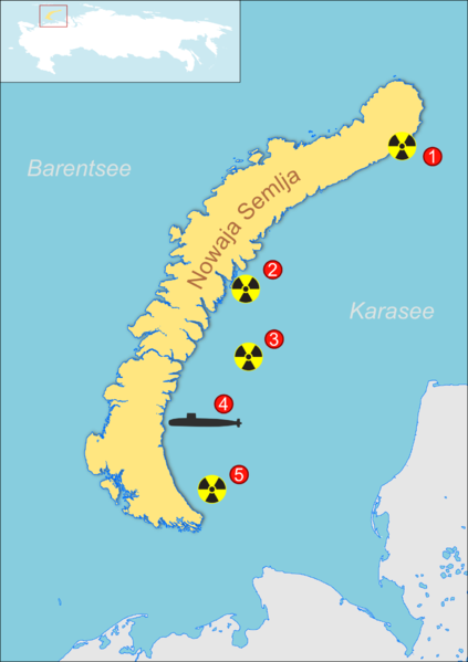 Ab 1955 wurde Nowaja Semlja unter dem Codenamen „Objekt 700“ für Atombombentests der damaligen Sowjetunion genutzt. Auf der Insel fanden zwischen dem 21.09.1955 und 24.10.1990 zahlreiche Atomwaffentests statt, u.a. am 30. Okt 1961 die größte jemals gezündete Atombombe „Zar“. Insgesamt wurden in dem Gebiet bis 1990 in drei Zonen 130 Kernwaffenversuche durchgeführt, darunter 88 atmosphärische, 39 unterirdische und 3 unter Wasser.