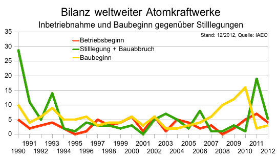 In 2012 wurden zwei Meiler neu in Betrieb genommen: Shin-Wolsong-1 (27.01.) und Shin-Kori-2 (28.01.), beide in Südkorea. Dem gegenüber wurden drei Reaktoren stillgelegt: Oldbury-A1 (29.02.) und Wylfa 2 (25.04.), beide in England; sowie Santa Maria de Gorona am 16.12. in Spanien. Zudem gab es die offizielle Aufgabe der Baustelle im bulgarischen Belene, wo mit Unterbrechungen seit 1987 an zwei Blöcken gebaut wurde. Mit einer Volksabstimmung will das Land das endgültige Ende des Projekts noch verhindern.