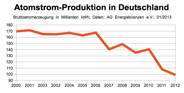 Ursache sind natürlich die Anfang 2011 endgültig stillgelegten acht Reaktoren. In 2010 betrug die Produktion nach ca. 140 Milliarden kWh, in 2011 noch ca. 108 Milliarden kWh (-23 Prozent). In 2012 nahm die Atomstromproduktion nun nochmal um nicht ganz 10 Prozent ab.