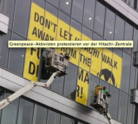 Greenpeace–Aktivisten protestieren heute an der Europazentrale von Hitachi-Power für ein verschärftes Haftungsrecht bei Atomunfällen. Die Umweltschützer beschriften die Fassade mit der Botschaft „Don´t let Hitachi walk away from the Fukushima disaster“ (sinngemäß: Hitachi muss Verantwortung für Fukushima übernehmen).
