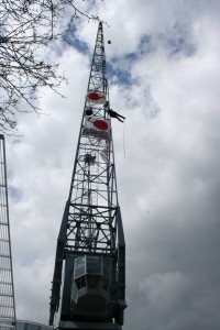 Nach dem 16stündigen Brand auf einem Frachter mit radioaktiver Ladung im Hamburger Hafen Anfang Mai protestierten Aktive heute in luftiger Höhe gegen weitere Atomtransporte und die mangelhafte Information der Bevölkerung. Mehrere AktivistInnen von ROBIN WOOD forderten mit einer Kletter- und Banneraktion an einem historischen Kran in der HafenCity (Kaiser-Kai) einen Stopp von Atomtransporten durch die Hansestadt.