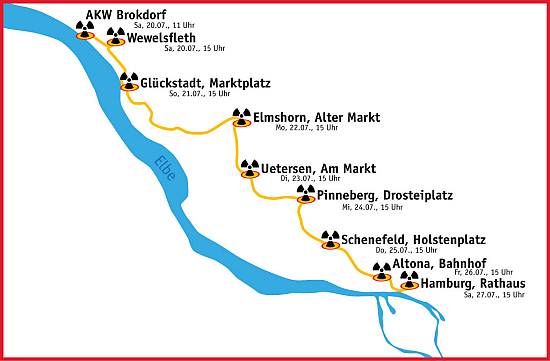 Zusammen mit der Anti-Atom-Initiative Pinneberg, Brokdorf-akut und der Göttinger Anti-Atom-Initiative hat die Initiative ausgestrahlt deshalb eine „Karawane gegen das AKW Brokdorf“ organisiert, die am Samstag, 20. Juli am AKW startet. Abschluss ist am Samstag, 27. Juli, um 15.00 Uhr in Hamburg auf dem Rathausmarkt. Die Karawane ist ein Protestmarsch, besondere Aufmerksamkeit erregt sie mit einem Krankenbett, das sie begleitet und die Krebsgefahr durch das AKW symbolisiert.