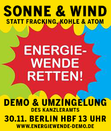 Bundesweite Großdemo am Samstag, 30. November, in Berlin – Wir sind dabei! Viele Menschen wollen nicht tatenlos zusehen, wie die Energiewende ausgebremst und schlechtgeredet wird. Statt wirklich konsequent den Ausbau der Erneuerbaren Energien voranzutreiben, setzen Regierung und Wirtschaft weiterhin auf Atom und Kohle. Statt die Atomkraftwerke sofort stillzulegen, torpedieren die Energiekonzerne die Energiewende.