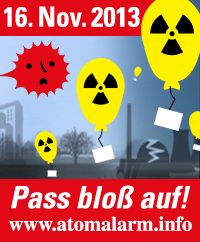 Am 16.11.2013 um 5 vor 12 Uhr lassen AtomkraftgegnerInnen an sechs Atomkraftwerken in Deutschland Luftballone aufsteigen. Mit dieser Aktion soll untersucht werden, wie sich radioaktive Stoffe bei einer großen Reaktorkatastrophe ausbreiten würden.