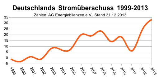 Im letzten Jahr betrug der Überschuss rund 33 Terawattstunden (TWh) und übertrifft damit den bisherigen Rekord von 23,1 TWh aus 2012. Insgesamt haben Deutschlands Kraftwerke mit 629 TWh fast genauso viel wie im Vorjahr erzeugt – es wurde also im Inland weniger Strom verbraucht. Wie heise.de berichtet ist seit Anfang der 1990er Jahre bis 2007 der Stromverbrauch in fast jedem Jahr gestiegen. In dem „Bruttostromverbrauch“ sind auch Netzverluste und der Eigenverbrauch der Kraftwerke enthalten, der bei Atomkraftwerken besonders hoch ist. 2012 habe er beachtliche 35,1 TWh betragen.