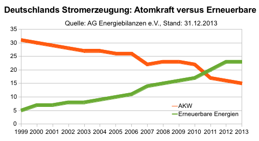 Atomkraft hat mit 15,4 Prozent einen immer geringeren Anteil an der Bruttostromerzeugung und wurde auch in letzten Jahr deutlich von den Erneuerbaren Energien überholt (23,4 Prozent). Die letzten neun Meiler lieferten insgesamt 97 Terawattstunden (TWh) und damit 2,5 TWh weniger als 2012.