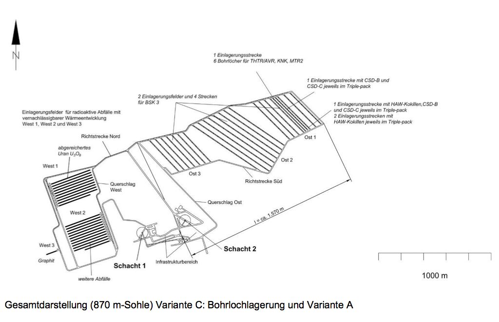 Die Tochter der Deutschen Gesellschaft zum Bau und Betrieb von Endlagern für Abfallstoffe (DBE), die DBE TEC, hat bereits detaillierte Pläne vorgelegt, welche Arten von Abfallstoffen im Salzstock Gorleben an welcher Stelle eingelagert werden sollen. Neben abgebrannten Brennelementen, verglasten hochradioaktiven Kokillen, komprimierten Wärme entwickelnden Hülsen und Strukturteilen in den Felder Ost 1-3, sollen auch schwach- und mittelaktive Abfälle eingelagert werden. Zum Beispiel abgereichertes Uran, graphithaltige Abfälle und darüberhinaus offensichtlich alles, wofür es im Schacht Konrad keine Genehmigung gibt, und zwar in den Feldern West 1-3.