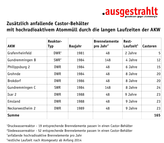 Allein 2013 seien in den neun AKW in Betrieb Atommüll für 24 weitere Castoren angefallen. Bis 2022, wenn die letzten sechs AKW vom Netz gehen sollen, werden insgesamt noch hochradioaktive Stoffe für weitere 165 Castor-Behälter produziert, hat ausgestrahlt errechnet. Die 26 Castoren, um die es heute geht, sind also nur die Spitze des Eisbergs. Die weitaus größeren Probleme blenden Bund und Länder aus, meint Jochen Stay, Sprecher von ausgestrahlt.