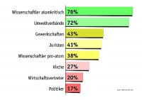 76 Prozent der Befragten halten atomkritische Wissenschaftler für „sehr vertrauenswürdig“ oder „eher vertrauenswürdig“, die damit den Spitzenwert erreichten. Ähnlich hoch ist das Vertrauen gegenüber den Umweltverbänden mit 72 Prozent. Die schlechtesten Werte erzielen Wirtschaftsvertreter mit 20 Prozent und Politiker mit 17 Prozent.