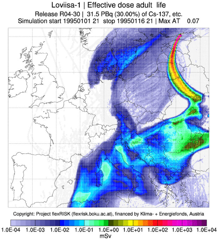 Das oesterreichische Instrument „FlexRisk“ zur Ermittlung der Auswirkungen schwerer Unfaelle in europaeischen Reaktoren veranschaulicht die Gefahren, die von den Reaktoren in Finnland, Schweden und Russland auf alle Nachbarlaender der Ostsee ausgehen. Es simuliert eine Vielzahl verschiedener Wetterbedingungen und unterschiedlicher Szenarien der Freisetzung radioaktiver Isotope nach